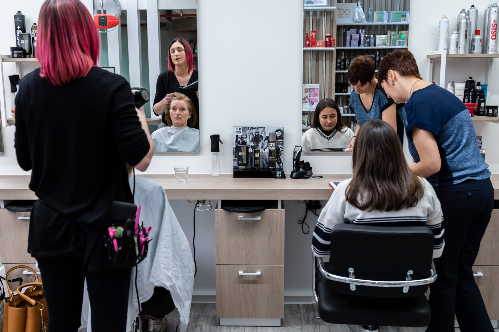 Ons Red kapsalon in Wijnegem Shopping, is onlangs volledig vernieuwd. Wij kozen voor natuurlijke toonaarden en planten. Wij willen een sfeer van rust uitstralen, waar een 'me momentje' echt kan. Geniet van ons kapsalon. En van onze heerlijke Latte of Cappucino.
